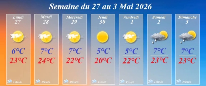 Dès lundi, le thermomètre grimpe rapidement avec 23°C attendus, sous un ciel bien dégagé. Une tendance qui se confirme mardi et mercredi avec des maximales atteignant jusqu’à 24°C, accompagnées d’un soleil dominant malgré quelques passages nuageux.